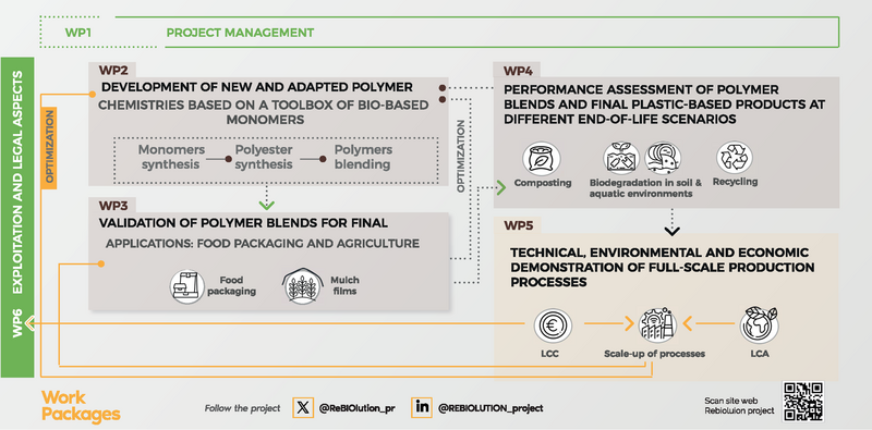 The use of alternative fossil-free raw materials, such as bio-based or recycled raw materials, as well as recyclable and/or biodegradable materials plays a central role in achieving these circularity goals in the framework of ambitious targets within EU Green Deal. REBIOLUTION aims to design and synthetize novel fully bio-based and biodegradable polyester blends based on 2,5-Furandicarboxylic acid (FDCA) and other bio-based monomers fit for specific product market applications (for paper food packaging and agricultural films). These fully bio-based, biodegradable and recyclable plastics will be originated from annually renewable sources and will be biodegradable in home and industrial composting, soil and aquatic environments. They will enhance circularity in applications where mechanical recycling is not possible and will be safe of use.